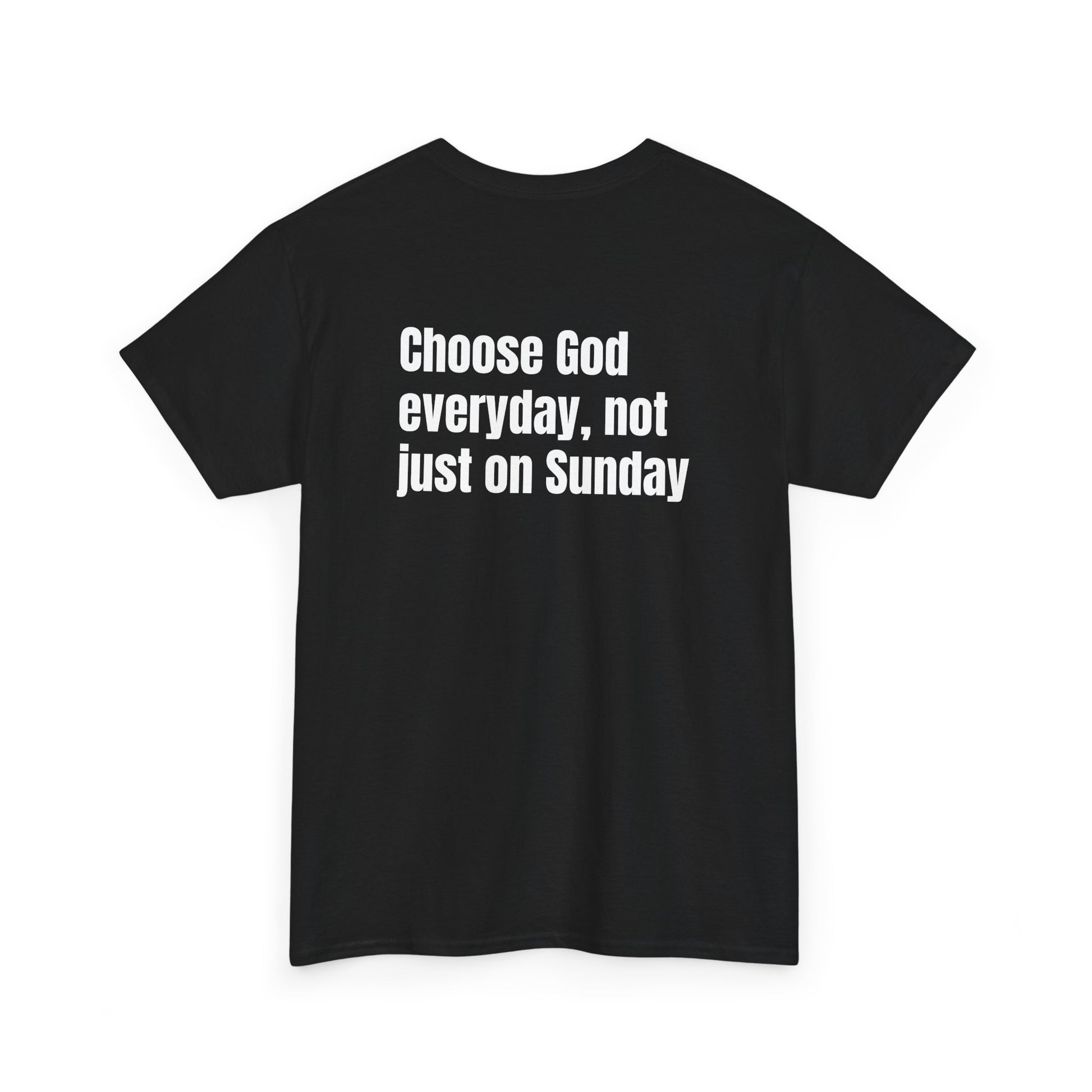 Elevate your faith and style with this “Choose God everyday, not just on Sunday” tee — a simple yet powerful reminder to live your beliefs beyond the weekend. Designed in bold white lettering on a sleek black backdrop, this shirt embodies consistency, devotion, and daily purpose.