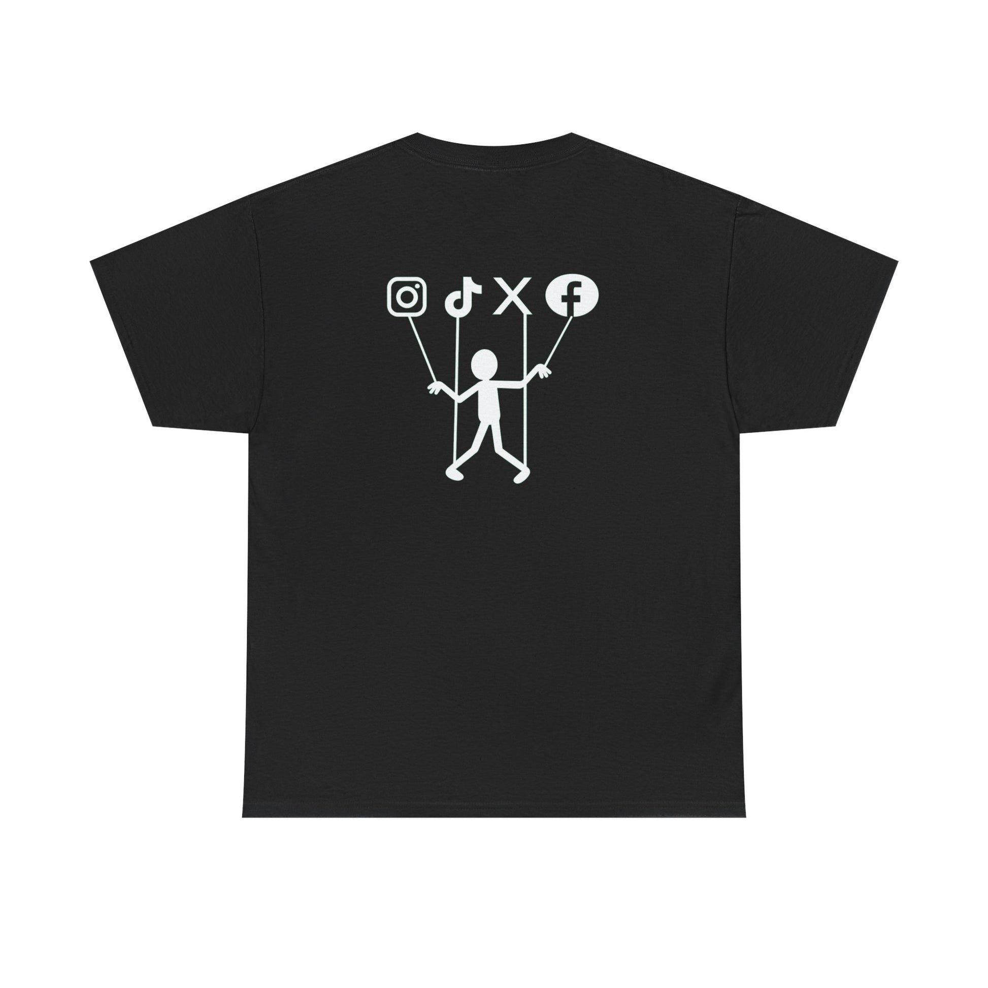 This bold graphic tee makes a powerful statement about modern life and social media influence. Featuring a minimalist puppet figure being controlled by the logos of the world’s biggest platforms — Instagram, TikTok, X, and Facebook — the design exposes the quiet manipulation behind our scrolling habits.
